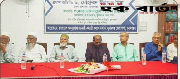 ঈদ পুনর্মিলনী অবসরপ্রাপ্ত সরকারী কর্মচারী কল্যাণ সমিতির। স্টাফ রিপোর্টার : বাংলাদেশ অবসরপ্রাপ্ত সরকার কর্মচারী কল্যাণ সমিতি জেলা শাখার উদ্যেগে ঈদ পুনর্মিলনী অনুষ্ঠিত হয়েছে। শনিবার বেলা ১১টায় সুনামগঞ্জ পৌর শহরের শহীদ মুক্তিযোদ্ধা জগৎজ্যোতি পাবলিক লাইব্রেরি মিলনায়তনে এই অনুষ্ঠান হয়। অনুষ্ঠানে সভাপতিত্ব করেন বাংলাদেশ অবসরপ্রপ্রাপ্ত সরকারী কর্মচারী কল্যাণ সমিতি জেলা শাখার চেয়ারম্যান প্রফেসর ন্যাথানায়েল এডউইন ফেয়ারক্রস। এতে প্রধান অতিথির বক্তব্য রাখেন জেলা প্রশাসক ড. মোহাম্মদ ইলিয়াস মিয়া। অনুষ্ঠান শুরুতে স্বাগত বক্তব্য রাখেন- সাবেক সিভিল সার্জন ও সংগঠনের সাবেক সভাপতি ডা. সৈয়দ মনোওয়ার আলী।